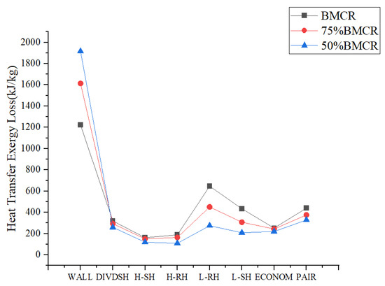 (2) The calculation and comparison of heat transfer exergy losses are carried out for each superheater and reheater in the rear flue. Due to the significant heat transfer temperature difference and exergy loss value, the heat transfer exergy loss value of the water wall and low-temperature reheater are relatively large.