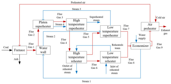 The feed water (TO-WATER) is heated by the economizer and turned into hot water (OUTWATER). Meanwhile, the heat exchange temperature in the water-cooled wall increases. Afterwards, it is heated by a roof superheater (TOPH), low-temperature superheater, partition screen superheater, and high-temperature superheater and turned into superheated steam. In the final step, superheated steam is transferred to a steam turbine. The reheated steam (IN-RH) is heated by a low-temperature reheater and a high-temperature reheater and supplied to the steam turbine. The airflow is cold air (COLD-AIR) in the air preheater, and heat is exchanged with the tail flue gas and turned into hot air (HOT-AIR). Combustion and heat transfer system flow charts are combined to form a closed cycle, which constitutes the entire system of the boiler. That is, the flue gas separated from the SSplit module passes through the water wall, and the hot air from the air preheater participates in the combustion. The overall model diagram is shown in Figure 7.