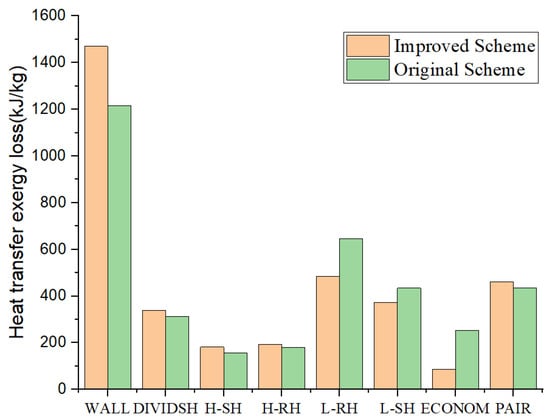 (3) An improved scheme is proposed in this paper, which plays a role in reducing the heat exchange capacity of the economizer and increasing the heat exchange capacity of the air preheater. The combustion temperature of the boiler is increased, and the combustion exergy loss of the boiler is reduced. By improving the steam parameters, the exergy loss of heat transfer is reduced, and the exergy efficiency of the boiler is improved.