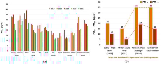 (a) Monthly national average concentrations of PM2.5 in South Korea [3]. (b) PM10 and PM2.5 criteria recommended by the WHO and the Ministry of Environment and average concentrations of PM10 and PM2.5 in South Korea in 2020 [3,4,5].