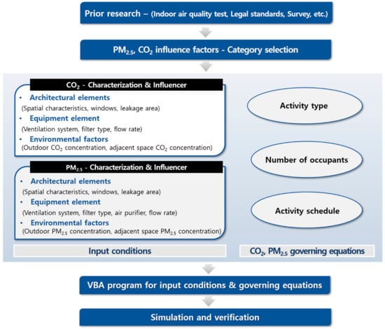 First, the prior research of the influencing factors to be selected for the Input sheet was investigated through analyses of architectural drawings and experimental data. In particular, the major factors of changes in PM2.5 and CO2 concentrations were identified through experimental data analysis. Second, factors affecting PM2.5 and CO2 concentration changes were selected. The selected influencing factors were used as input conditions that the user could input or select during program operation [29,31]. Third, input conditions (space volume, number of occupants, air volume, etc.) were applied to the mass and concentration conservation equations. The equations derived from these serve as the final predictions of PM2.5 and CO2, which change with time. In addition, the program was configured by inputting VBA code to run it for each instructional schedule (number of occupants, hours of use, operation of air purification facilities, etc.) input by the user. Finally, to verify the accuracy of the simple indoor air quality diagnosis program, the calculated results were compared with the measured data.