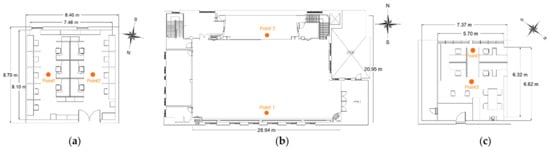 Indoor air quality measurement site drawing: (a) a 60.4 m2 office space, (b) a 616.1 m2 multipurpose activity space, and (c) a 48.7 m2 office space.