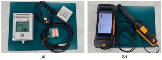 Photos of indoor air quality measuring devices used: (a) IAQ160, SCD40, and Sensirion SPS30 for the PM2.5 concentration and (b) Testo 400 for the CO2 concentration.