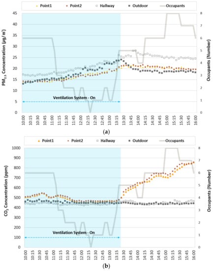 Figure 6 is a graph of PM2.5 and CO2 concentrations measured from 10:00 to 16:00 on 12 August. As shown in Figure 6a, the PM2.5 concentration of Point 2 was measured at a maximum of 22 µg/m3 between 13:45 and 14:00, while the hallway PM2.5 concentration maximum was 28 µg/m3 at the same time interval. Figure 6b is the analysis result of the CO2 concentration. The CO2 concentration of Point 2 increased to a maximum of 860 ppm at 16:00 due to an increased number of occupants after lunchtime. However, the outdoor and hallway CO2 concentrations remained below approximately 500 ppm.