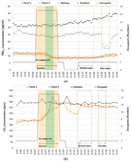 PM2.5 and CO2 concentration test results for 616.14 m2 multipurpose activity space on 18 November 2021. (a) PM2.5 concentration. (b) CO2 concentration.