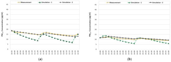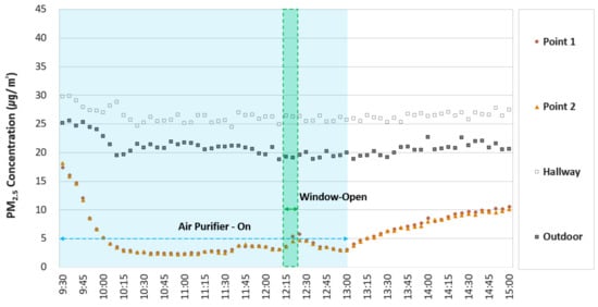 As shown in Figure 8, the air purifier was in operation from 9:30 to 13:00, and the initial PM2.5 concentration at Point 2 decreased from 18.15 µg/m3 at 9:30 to 2.25 µg/m3 at 10:55. Moreover, when the window was open between 12:11 and 12:22, the concentration of Point 1 increased by approximately 2.67 µg/m3, from 3.07 to 5.74 µg/m3.