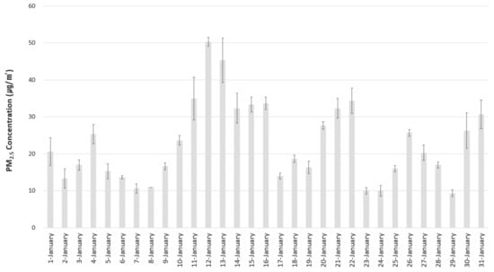 This study utilized Our Neighborhood’s Atmospheric Information and the Annual Report of Air Quality in Korea 2020 provided by the Korea Environment Corporation to check the changes and deviations in PM2.5 concentrations depending on regional location [44,45]. The data from Our Neighborhood’s Atmospheric Information were utilized to analyze the standard deviation of PM2.5 concentration based on the three locations where the previous measurement experiment was conducted (two in Seoul and one in Pyeongtaek, Gyeonggi-do). The standard deviation analysis was conducted based on data gathered in January, when the number of days with a high PM2.5 concentration by year is high in South Korea [46]. The average deviation of PM2.5 concentration in January 2021 in the three regions was 2.07 µg/m3, and as shown in Figure 9, the highest deviation was 6.02 µg/m3 on 13 January.