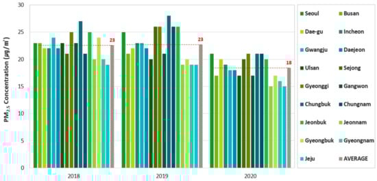This study utilized the Annual Report of Air Quality in Korea 2020 to check the annual average PM2.5 concentrations by city and province [45]. As a result, the PM2.5 concentration in the Chungcheongbuk-do region in 2018 and 2019 was the highest, while that in Jeju was the lowest. Furthermore, the average annual PM2.5 concentrations in South Korea were 23 µg/m3 and 18 µg/m3 in 2018 and in 2019 and 2020, respectively, indicating a decreasing trend in the annual PM2.5 concentration (Figure 10).