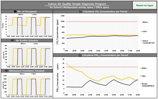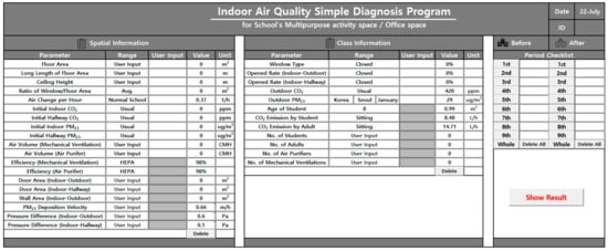 Thus, this study developed an indoor air quality diagnosis program for office and multipurpose activity spaces at schools that enables nonexperts to accessibly determine the change in pollutants in these spaces. The program proposed in this study was made with Visual Basic for Applications (VBA) and the Microsoft Excel program, which nonexperts such as teachers and school managers can easily access and use to predict indoor air quality. This study presented a tool that can be compared with the initial plan so that nonexperts can diagnose the indoor air quality before and after class and improve it by using ventilation equipment, such as an air purifier, when it exceeds the indoor air quality maintenance standard range.
