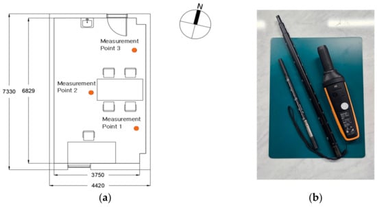 The indoor air quality test data, which were collected on 12 August 2021, were utilized to analyze the changes in air quality concentrations in an indoor space depending on the changes in PM2.5 and CO2 concentrations outdoors and in hallways. This space was an office space capable of accommodating a maximum of 15 people with a floor area of 60.43 m2 [32]. Points 1 and 2 were measured at the 1.2 m level by considering the respiration height [32,33,43].