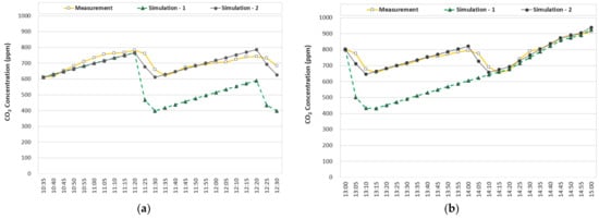 According to the comparison between the CO2 measurement results and those from Simulation 1, as shown in Table 8, the average RMSE was 154.11 ppm, and the percentages were relatively high at 21.17% and 17.84%, respectively. According to the comparison between the CO2 measurement results and those from Simulation 2, the average RMSE was 25.61 ppm, and the percentages became 3.55% and 2.80%, respectively, which are much lower than those of Simulation 1. The RMSE percentage of Simulation 2 was 17.6% lower than that of Simulation 1, showing better accuracy.