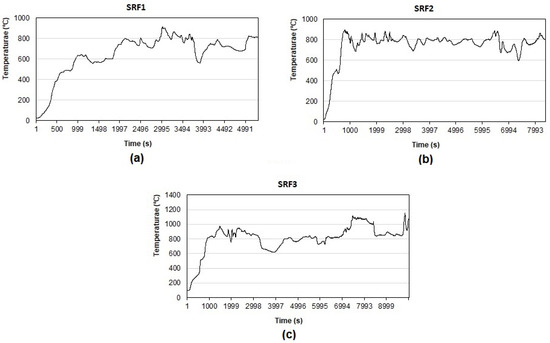 Temperature profiles over time for each gasification test using (a) SRF1, (b) SRF2 and (c) SRF3.