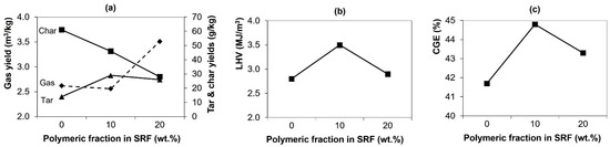 Summary of the effect of SRF polymeric fraction in some gasification parameters: (a) product yields, (b) lower heating value (LHV) of gas and (c) cold-gas efficiency (CGE).