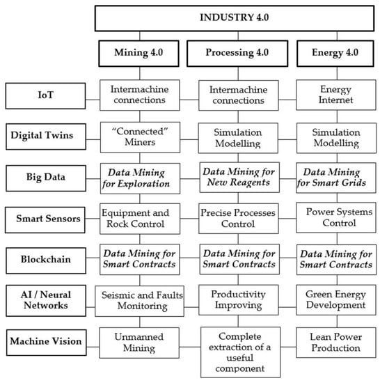 Some confusion can also be seen here, since Data Mining can be considered an end-to-end technology that transforms the use of computational optimization models in many industries []. However, at the level of methodology, Data Mining and Mining 4.0 fundamentally diverge. Thus, if for Data Mining the main research method is the analysis of the possibilities of optimizing the data flow, then for Mining 4.0 the most applicable method is the synthesis of the achievements of geotechnology and the family of digital technologies of Industry 4.0.