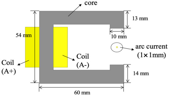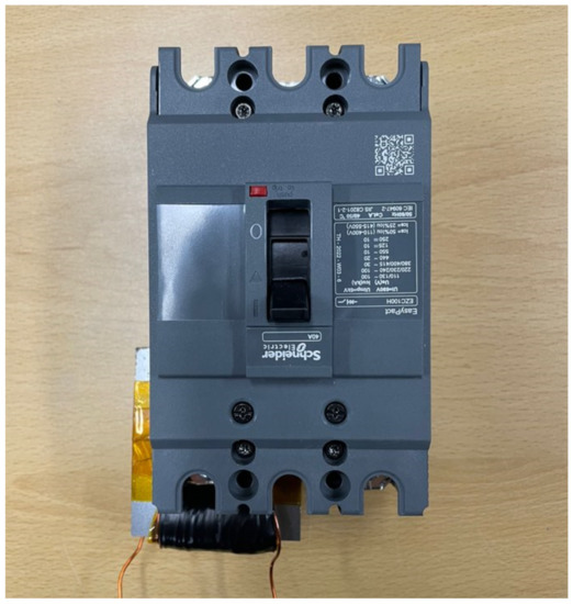 32 is a section in which arc energy is consumed after reaching the splitter plate. As a circuit breaker, Schneider’s EZC100H model is used in the experiment. To apply an external magnetic field to the arc generated between two electrodes, the core used in the pre-experiment is installed the circuit breaker, as shown in