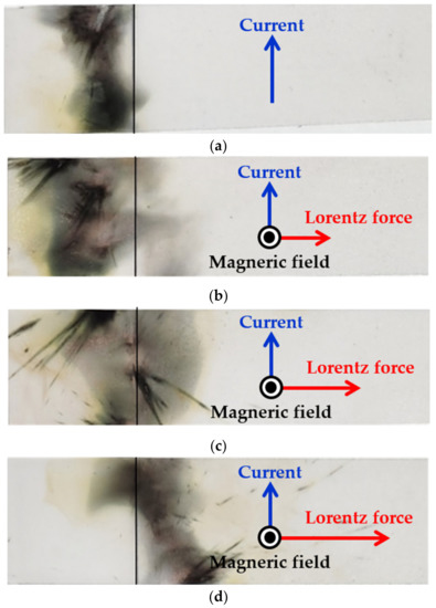 The results are as follows. First, in t10 period, there is little difference in the presence or absence of a magnetic field of about +0.02 ms. This means that the external magnetic field does not affect the internal Lorentz force determining t10. This internal Lorentz force is generated when the over-current flowing into the fixed electrode reciprocates, and in order to generate a large Lorentz force, the interval between the paths through which the current reciprocates should be narrow. Applying this experiment, in order for the external magnetic field to affect the Lorentz force, many magnetic fields must pass due to the wide gap in the passage, but it is difficult to have a significant impact because the gap in this passage must be small.