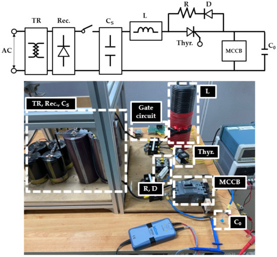 S generates an over-current and the frequency is adjusted through L. The frequency used in the experiment is 60 Hz, which is the commercial frequency. Thereafter, an over-current flows to the circuit breaker by applying a gate signal to the thyristor. A capacitor C