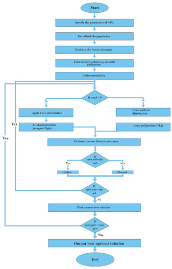 The FPA method presented by [38] is a swarm-based optimization technique motivated by flower genetic reproductive behaviour. Flowers reproduce through a pollination process, wherein the pollen of one flower is transferred to another through pollinators. Self-pollination occurs when a flower reproduces using its pollen or the pollen of other blooms on the same plant. Cross-pollination occurs when pollen is carried over great distances by pollinators. Self-pollination is also known as local pollination, whereas pollination across large distances is known as GPP. In the GPP, the pollen takes more giant steps and exhibits Levy flight behavior. Hence, the mechanism of Levy distribution is employed for achieving GPP [39]. The parameter ‘p’ determines whether the population is formed via self-pollination or cross-pollination when FPA develops a new population. This is accomplished by creating a random variable ranging from 0 to 1 and comparing it to ‘p’, with GPP occurring if the random value is smaller than ‘p’. Agents would walk with a variable step size of length from one bloom to the next for GPP, as approximated by the Levy distribution of flight [36,37] and mathematically stated as Equation (6):