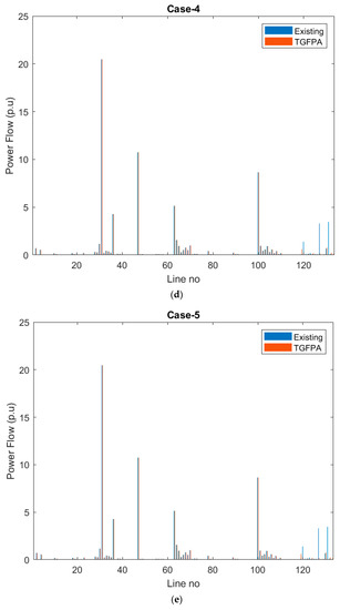 (a) Power flow Comparison for IEEE 119=bus system during case 1; (b) power flow comparison for IEEE 119 = bus system during case 2; (c) power flow comparison for IEEE 119-bus system during case 3; (d) power flow comparison for IEEE 119-bus system during case 4; (e) power flow comparison for IEEE 119-bus system during case 5.