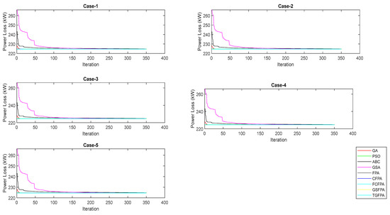 In this section, TGFPA is validated and accepted as a point. This technique is executed in MATLAB 2020, and the results are tested. It is validated with the consideration of IEEE 33, IEEE 69, IEEE 119, and the Indian 52-bus system. It has 32 GB of RAM and a 4 GHz Intel Core i7 processor. The proposed technique is designed to reduce the PL of RDNs by optimizing the feeder connections after optimally placing DG units. This optimal network reconfiguration is computed with the help of a new methodology. It is utilized to find the optimal connections of tie switches in RDNs, reducing the PL. It is compared with current approaches such as GA, PSO, ABC, GSA, FPA, CFPA, FCFPA, and GSFPA. The main objective is to enable continuity of power by reducing PL. The proposed methodology is tested with five different cases, which are mentioned as follows: