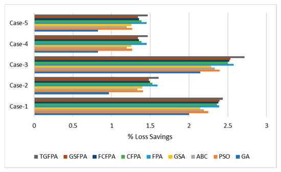 Percentage loss savings for 5 cases in the Indian 52-bus system.