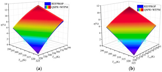 - The evaporation enthalpy, evaporation entropy, and thermal efficiency of the working fluid were calculated, and the errors between the results of “QSPR+WFPM” and those of REFPROP were analyzed.