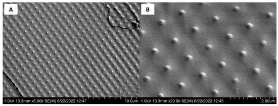 For greater control over the wet etching process, the wafer was cut into smaller pieces containing the rectangular pattern arrays using diamond-edged scalpels. A cleanroom cloth was placed over the wafer when cutting to ensure fragments did not contaminate the mold. The smaller pieces were placed into a KOH mixture bath. The mixture was 60% concentration at 40 °C. The mold was submerged in this mixture for 12.5 min exactly [26,27,28]. This mixture, temperature, and time combination allowed for an estimated etch depth of 550 nm, similar to the specifications of the original structures numerically simulated [22]. After 12.5 min, the mold was taken out of the KOH bath, immediately placed in an isopropyl alcohol bath for cleaning and prevention of further etching, and then dried with nitrogen gas.