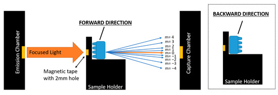 Schematic showing the testing setup in the forward direction with the 2 mm magnetic tape focusing hole. The angular dispersion of the ALT grating with the sample oriented for “forward” direction data collection is illustrated. The sample mounting for testing in the backward direction is also shown.