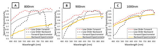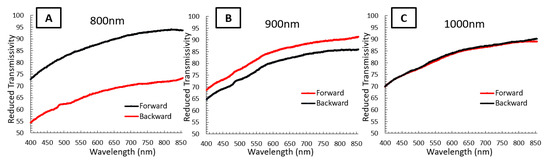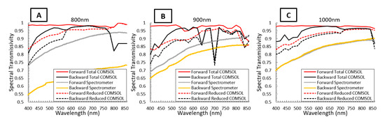 Spectrophotometer measurements for forward and backward spectral transmissivity for (A) 800 nm, (B) 900 nm, and (C) 1000 nm periodicity sample. Experimental error is ±3%.