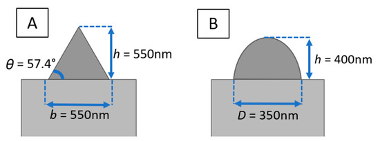 (A) Schematic of the modified pyramid shape expected from the KOH etch with a base width, b = 550 nm, a height, h = 550 nm, and an etch angle, θ = 57.4°. (B) Schematic of the hemispherical ellipsoid with a periodicity of 800 nm used to simulate the estimated shape of the fabricated nanostructures where diameter, d = 350 nm, and height, h = 400 nm.