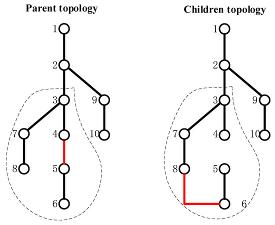 The crossover rule of line switches are as follows: Count the number of switches opened in each loop in parent topologies 1 and 2. Record two switches’ positions and get crossover operation if only one line switch is opened in both topologies and the disconnected positions are different. As shown in Figure 2, there are three loops of (2, 3, 9), (3, 4, 9, 10), and (3, 4, 5, 6, 7, 8) in the network. Loop (2, 3, 9) and loop (3, 4, 5, 6, 7, 8) have only one line switch opened, and the disconnected position is different in two parent topologies. Taking (3, 4, 5, 6, 7, 8) as an example, the opened line switch l34 and l68 are recorded and cross-operated to obtain two offspring with radial topology. Note that a single point crossover rule is applied at the load switch.