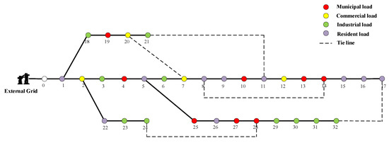 IEEE 33 distribution network contains 32 branches, 5 tie branches, and 1 power supply. The first reference voltage is 12.66 kV and the three-phase power reference value is 10 MVA. The total network load is 5084.26 + 2547.32 j kVA. The basic network structure and the basic loops are given in Figure 4, and the parameters of each branch and load are given in Appendix A. Using the static load model, the total power consumption and the user load of the system are 3917.65 kW and 3715 kW normally. The initial power loss is 202.65 kW. The lowest bus bar voltage is 0.9133 p.u., and the five tie switches are normally open.