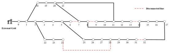As shown in Figure 5, the optimal topology obtained by the proposed method is (7, 9, 14, 32, 37), which is the same as those in references [13,19]. After reconfiguration, the total power consumption and the active power loss of IEEE33 system are 3845.47 kW and 139.47 kW, implying a reduction of 31.18% in total power loss. The minimum node voltage of the system is improved to 0.9378 p.u., which is 2.68% higher than that of the initial structure. Thus, it can be concluded that the proposed model enables to obtain a better radial distribution network topology with smaller power loss and voltage difference of nodes when compared with the initial distribution network.