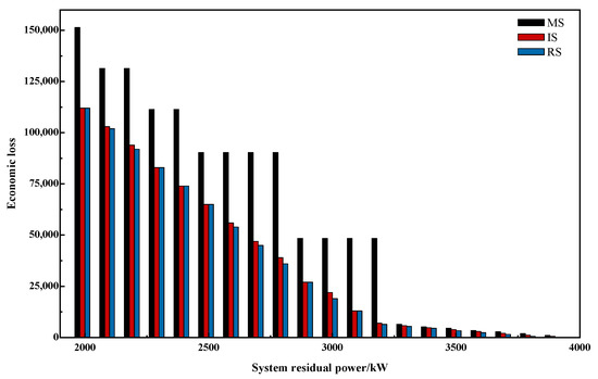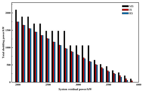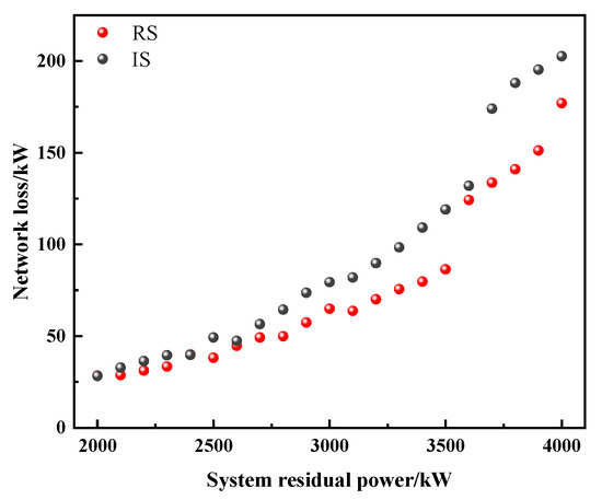 Taking the test point with 3900 kW residual power as an example, it can be found that it does not require load shedding operation when the RS method is adopted, whereas 45 kW active load should be shed when IS method is used. To explore the reasons, the network losses under different residual power values are analyzed, as shown in Figure 9. Results in Figure 9 suggest that the shed power reduced by the MS method is not obvious when the system residual power is small (<3000 kW). This is because that the MS method reduces the network loss by adjusting the distribution network topology to achieve the purpose of less load shedding. Since the network loss is much smaller than the total load, the shed power reduced by the MS method is limited and will be affected by the system residual power of the distribution network. Theoretically, the power loss and the reduced shed power will decrease with the system residual power. However, the advantages of the MS method in reducing network loss are gradually highlighted under large system residual power, greater than 3000 kW for example, which effectively reduces the total load shedding. Therefore, it can be inferred that when the system residual power is in the interval of (3845.47 kW, 3917.65 kW), the power balance of the system can be sufficiently satisfied by reconfiguring the distribution network topology instead of performing the load shedding operation.