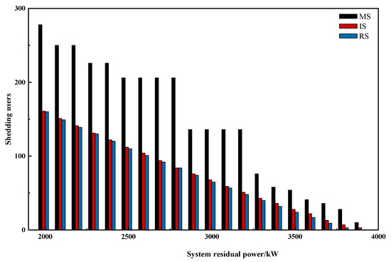 Figure 6 shows the comparison of load shedding results obtained by different methods with objective function 1. The results of multi-step load shedding method (MS), load shedding method without network reconfiguration (IS), and reconfiguration–load shedding method (RS) are separately denoted by a black column, a red column, and a blue column. Figure 7 and Figure 8 present the comparison of economic loss and the number of shedding users corresponding to the three load shedding methods.