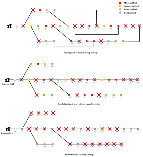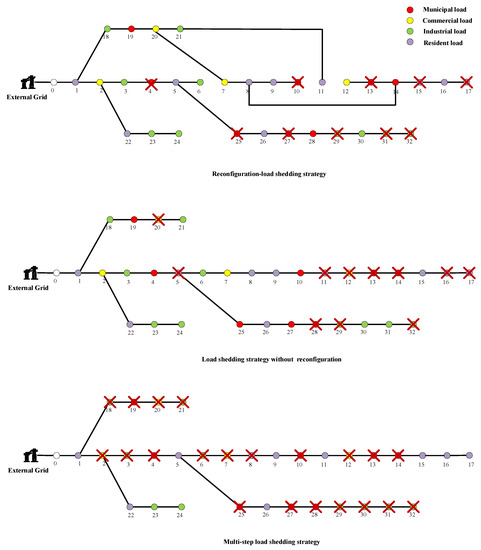However, most of the above load shedding strategies set switches on load nodes and minimize the total shedding loss by preferentially shedding user loads with low priority, which do not substantially reduce the shed power of users. Existing research has pointed out that distribution network reconfiguration can effectively reduce the network losses, improve node voltage levels, and balance loads. In Ref. [24], a mathematical model aiming at the minimum network loss was established for network reconfiguration and was solved by harmony search algorithm. The result showed that the network loss is reduced by more than 30% and the voltage level of some nodes is significantly improved by network reconfiguration. A mixed-integer second-order cone programming (MISOCP) model for network reconfiguration was also proposed by performing second-order cone relaxation on branch power flow equations in Refs. [25,26,27]. In Ref. [28], an improved genetic algorithm was used to solve the network reconfiguration model, which improved the computational efficiency. Therefore, since network reconfiguration can effectively reduce network loss, the distribution network reconfiguration process and the load shedding process can be combined by changing the states of tie switches, sectional switches, and load switches when there is a large power deficit in the distribution network. In this way, the shed power and the economic loss of power outage can be minimized.