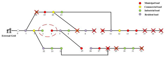 Figure 12 is the disconnected load distribution obtained by RS method under the objective function 1. The total shed power is 980 kW, which is slightly higher than that in Figure 6 (965 kW) when the line state is normal. It suggests that the RS method is not limited by individual line fault, and can find the optimal topology and the corresponding load shedding node combination in the remaining distribution network structures according to the line fault information. Compared with the existing load shedding methods, the proposed RS method has more advantages in this complex environment with both power fluctuation and line fault.