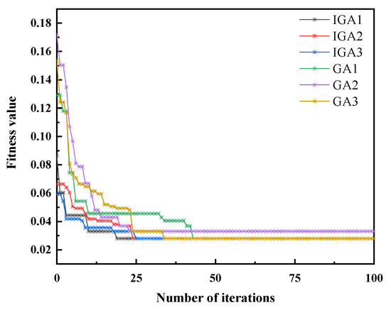 In this section, the improved genetic algorithm (IGA) and the traditional GA are used to optimize the load shedding scheme with the residual power of 2900 kW, in order to verify the effectiveness of the improvements in GA. The fitness values of the two algorithms are calculated three times respectively, as shown in Figure 13. It can be seen that GA reaches the optimal fitness value of 0.02799 for twice after more than 35 iterations, whereas the IGA finds the optimal fitness value of 0.02799 after less than 25 iterations in the three calculations. It indicates that IGA has better optimization ability and algorithm stability. It can also be seen from Figure 13 that the improvement of population generation method improves the overall quality of the initial population, while the improvement of crossover and mutation operators enhances the search ability of the algorithm. All these practices accelerate the convergence rate and improve the stability of the algorithm.