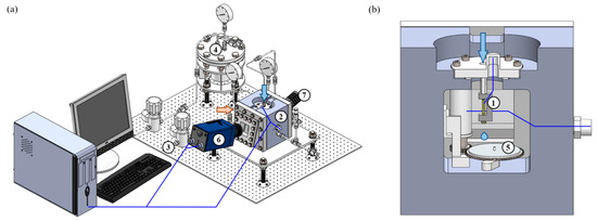 (a) Schematic diagram of the experimental setup for the droplet impact at elevated ambient pressures and (b) sectional view of the pressure vessel where the experimental equipment or pipeline corresponded to the serial number. (1) Droplet generator, (2) constant volume chamber, (3) regulating valve, (4) liquid tank, (5) solid surface, (6) high-speed camera, and (7) LED lamp. In (a), the orange arrow represents the injection of high-pressure compressed nitrogen into the chamber and the blue arrow represents the liquid supply into droplet generator respectively. The blue solid line represents the path for electrical signals and data.