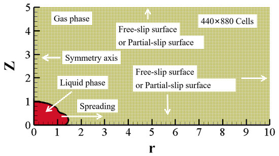 The FTM solves a single set of conservation equations with appropriate interface terms in the whole field with a Eulerian coordinate grid and tracks liquid–gas interfaces using a Lagrangian approach. Figure 2 shows the computational domain of the current numerical simulation. In the cylindrical coordinate, z-axis is structured by the droplet initial velocity normal to the surface, while the -axis is perpendicular to the droplet initial velocity. Axisymmetric boundary condition is specified for the -axis, while free-slip boundary conditions are specified to all of the other boundaries including the impacting solid surface.