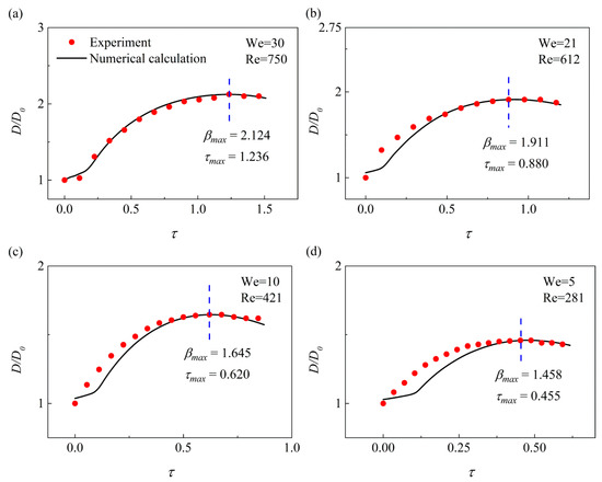 Comparison between the numerical calculation (denoted by the black solid line) and the experiment results (denoted by the red solid point) for the droplet non-dimensional diameter varied with non-dimensional time under 4 groups of impact parameters. (a) and , (b) and , (c) and , (d) and .