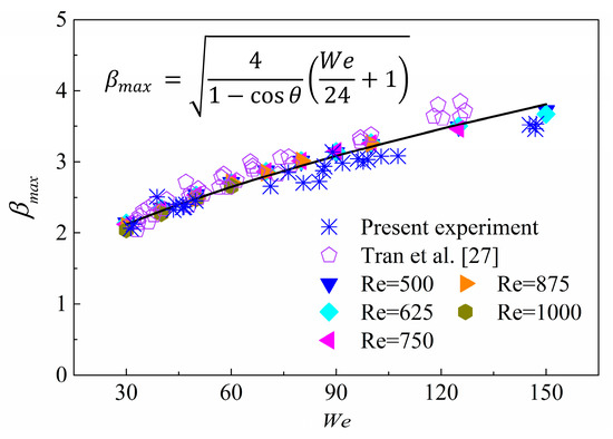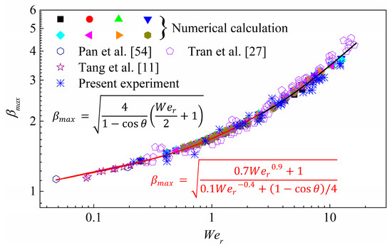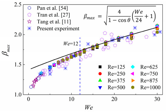 Figure 8 shows the prediction of under small Weber numbers (). Again, the solid line indicates Wildeman et al.’s model, while the experimental results of Pan et al., Tang et al., Tran et al. [27] and the present case are also shown in the figure for a comparison.
