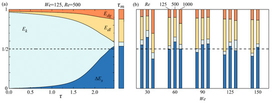 Figure 6a shows the evolution of four different energies during the droplet spreading process, while Figure 6b shows the energy budget at for various droplet inertias and Reynolds numbers. In this case we defined as the time instant when the droplet just contracts the surface. The initially non-zero at , shown in Figure 6a, can be attributed to the slight deformation together with the droplet moving-induced gas motion, and results in the viscous dissipation in either liquid or gas phases before droplet-wall contracting. The pre-dissipated energy is around 3% of the initial kinetic energy and slightly influences the energy budget, so that it can therefore be ignored in the present study. For energy budget shown in Figure 6b, all the predictions generally follow the “1/2 rule”. Although viscous dissipation in the liquid phase contributes more to , viscous dissipation in the gas phase, i.e., still cannot be ignored.