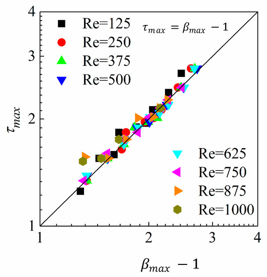 Very good agreement again appears between our numerical results and the predictions of Wildeman et al. Our predictions show that is generally Re-independent for relatively large Reynolds numbers (), once again, consistent with the tendencies of previous investigations [40,42].