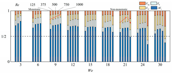 Since Wildeman et al.’s model is estimated according to the energy conservation approach associated with the “1/2 rule”, we subsequently show the energy budget in Figure 6, in which all the energies were normalized by the initial kinetic energy and therefore the sum of , and is the unity. To further investigate the viscous dissipation characteristics, we counted the energy dissipation in both liquid phase (denoted by ) and gas phase (denoted by ), and therefore . The “1/2 rule” is also indicated in each graph.