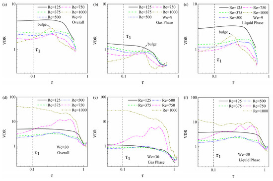Figure 10d,e accounts for that overall VDR decreases as Reynolds number increases from to 500 because a decrease in liquid viscosity reduces viscous dissipation. In this case viscous dissipation in the liquid phase contributes the majority of the overall VDR. However, as continually increases to 750 and finally 1000, the dual role of liquid viscosity is sufficiently strong to influence an energy dissipation tendency in which overall VDR substantially increases. The contribution of gas viscous dissipation gradually increases and in turn dominates the energy dissipation at , and therefore produces a non-monotonic energy budget, as shown in Figure 9.