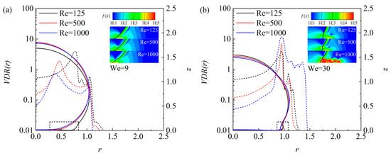 Figure 10 shows the time-dependent viscous dissipation rate (VDR) for droplet impacts under two different Weber numbers. For spreading with relatively small inertia (), as shown in Figure 10a–c, the lowest Reynolds number () generally produces highest overall VDR, most of which is contributed by the liquid viscous dissipation. As the Reynolds number increases to , overall VDR monotonically decreases because the increase of actually decreases liquid viscosity (characterized by the Ohnesorge number ). As Reynolds number further increases to , VDR in the earlier stage decreases, however, it produces a substantial “bulge” as time develops, which results in the VDR in turn being larger than smaller cases () in an appropriate time period. However, this reversion is insufficiently strong to influence the energy dissipation tendency. The “bulge” can be attributed to the dual role of liquid viscosity, which has been primarily discussed in the previous investigations [42,44]. Although the majority of the VDR is contributed by the liquid phase, the “bulge” can also be seen in the gas phases, indicating that the dual role of liquid viscosity influences energy dissipation in both liquid and gas phase.