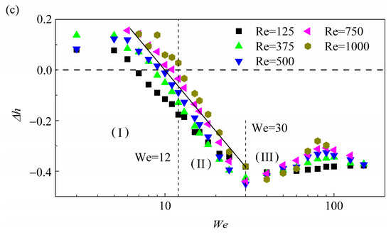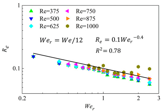 where is the contract angle and can be determined as in our simulations, as discussed in Section 3.1. can be further normalized by the as , which measures the relative importance of droplet height when compared to the droplet spreading diameter, and we found that is related to droplet impact inertia, as shown in Figure 14 that,