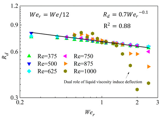 Moderate deviation under for relatively large cases can be attributed to the dual role of liquid viscosity in producing additional viscous dissipation which as discussed in the previous Section 3.2. In this case, surface energy increment can be express as . Meanwhile, cases under smaller are not the emphasis of the analysis in the current work and these data points are not used in the fitting for energy ratio in order to obtain a matching and suitable fitting result for the majority of cases.