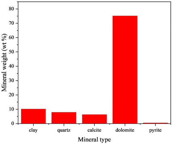 The methane purchased by Chengdu Keyuan Gas Co., Ltd. (Chengdu, China) was used to approximate the simulation of natural gas to investigate hydrogen generation. The debris grinded into 40~80 mesh, which were obtained from oil and gas fields located in the south-west, were used as filler in the experiments to model actual rock samples. The porosity and permeability were 0.28 and 126.35 mD, respectively. The X-ray fluorescence spectrum (XRF) and X-ray diffraction (XRD) results of debris are shown in Table 1 and Figure 1.